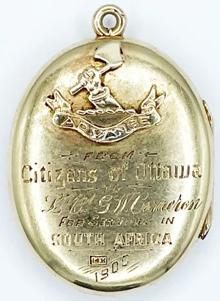 Very rare and interesting Boer War Welcome Home gold locket to Lt. Colonel George Whitfield Cameron DSO, Lord Strathcona Horse.